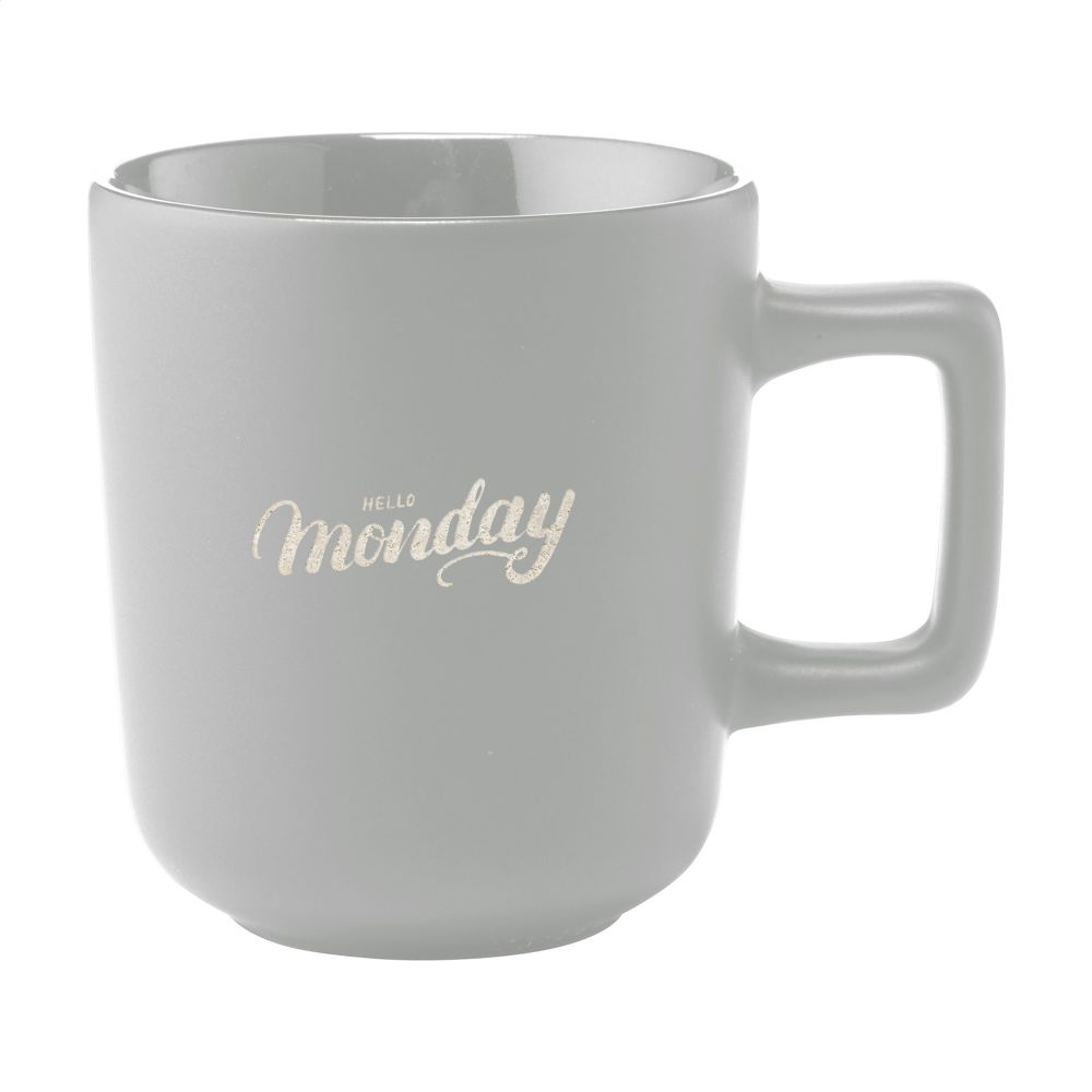 Mok van hoogwaardig keramiek met een opvallend oor. Afgewerkt met een matte buitenzijde en hoogglans binnenzijde. Vaatwasserbestendig. De opdruk is vaatwasmachine getest en gecertificeerd: EN 12875-2. Inhoud 280 ml. OPMERKING: De witte mok kan niet worden voorzien van een lasergravure omdat deze onvoldoende zichtbaar is.