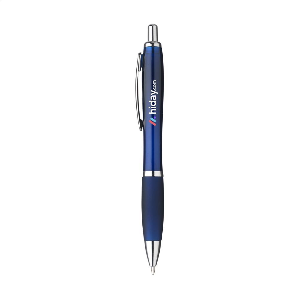Blauwschrijvende óf zwartschrijvende balpen met transparantgekleurde houder, gripvast voorstuk en metalen clip.