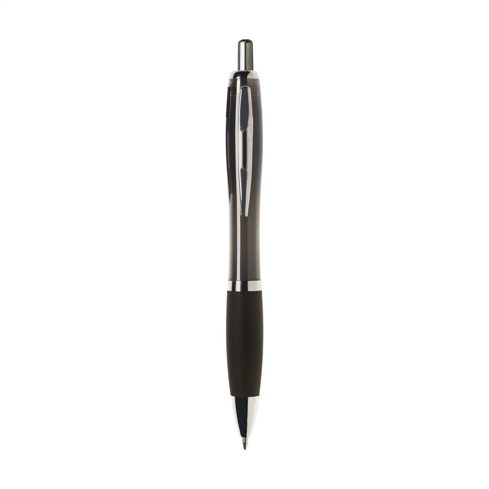 Blauwschrijvende óf zwartschrijvende balpen met transparantgekleurde houder, gripvast voorstuk en metalen clip.