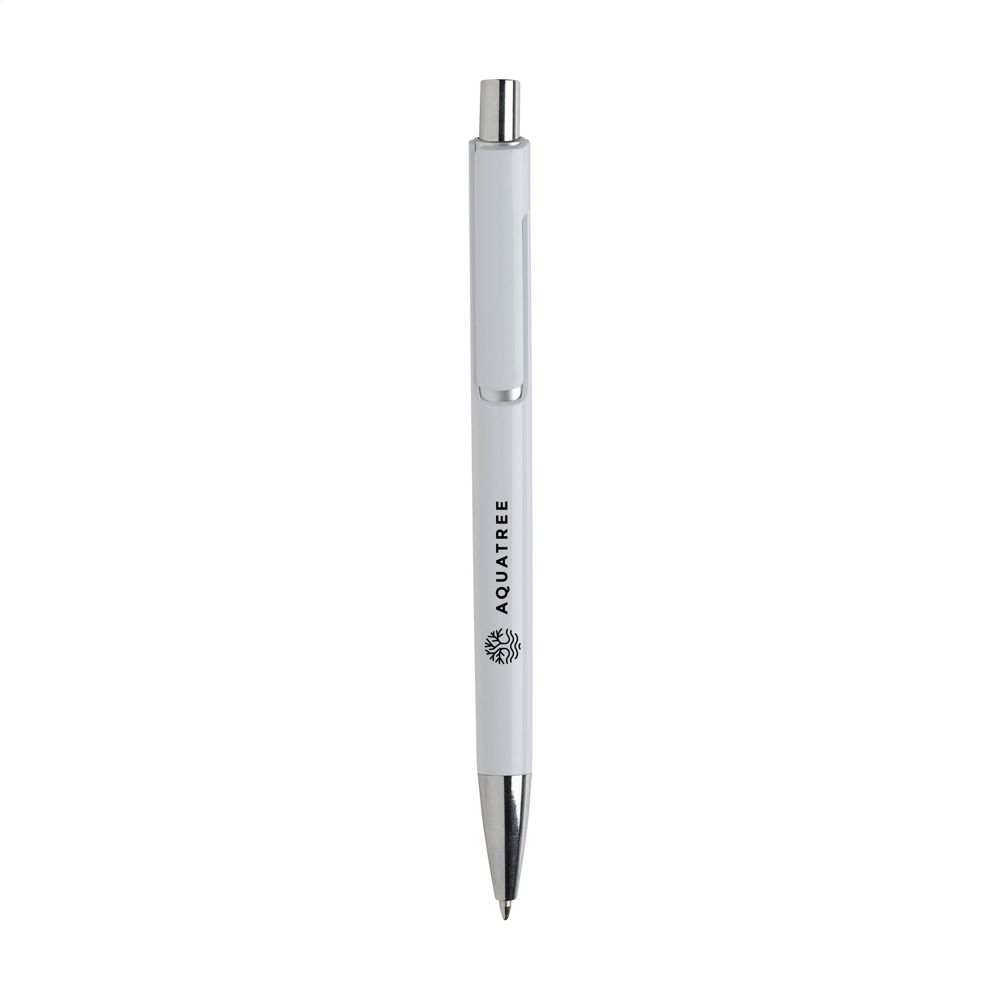 Blauwschrijvende balpen met uniek design: de body en clip van deze balpen zijn uit één geheel vormgegeven en dat maakt deze pen tot een bijzondere eyecatcher. Met opvallend zilverkleurig accent onder de optisch 'zwevende' clip.