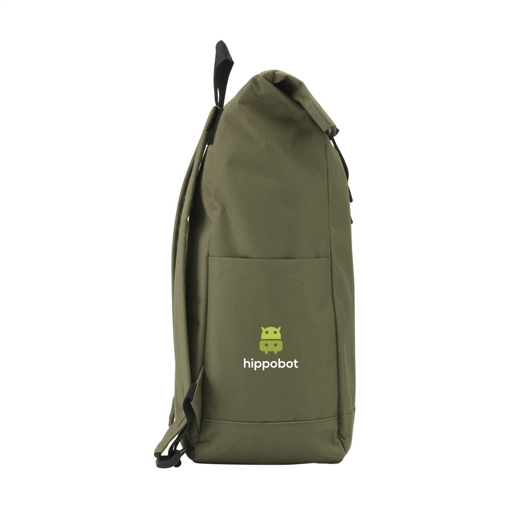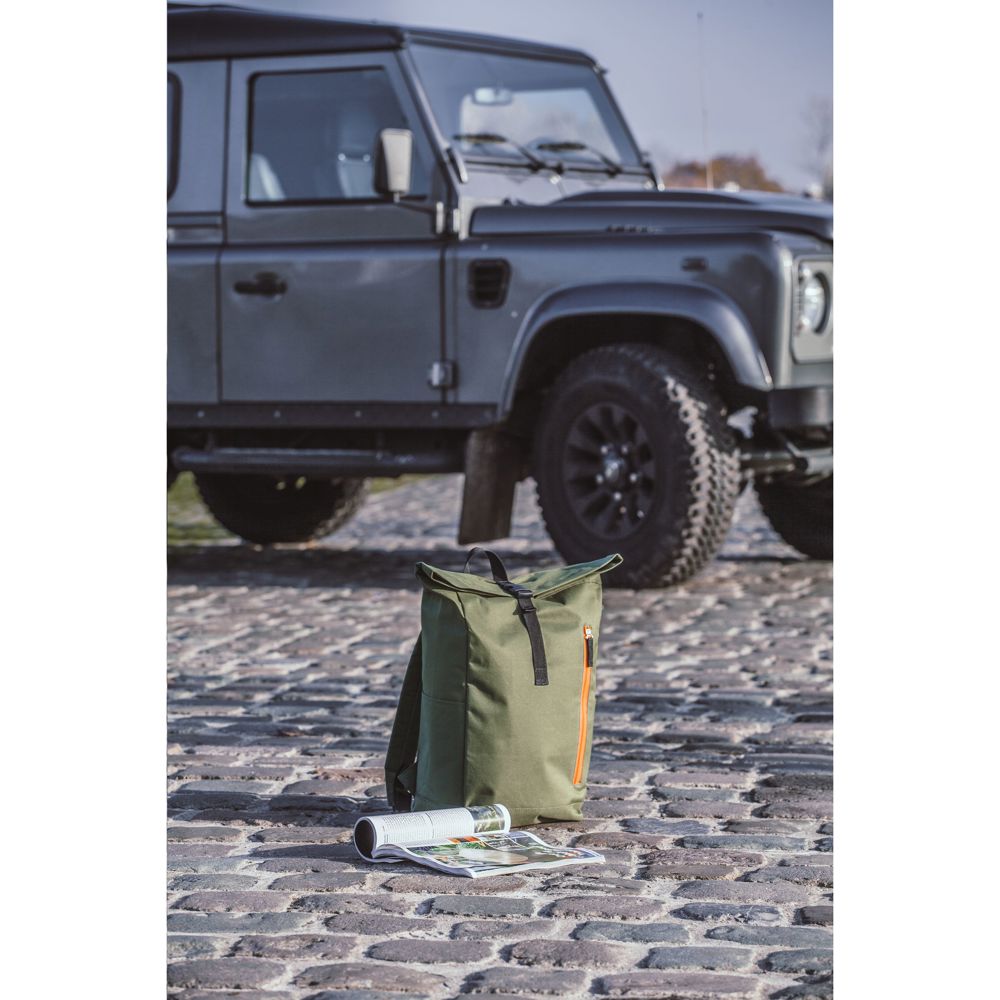 Stoere, praktische urban ‘roll-top’ rugzak van sterk 600D polyester met waterbestendige PVC binnenzijde, gedeeltelijk nylon gevoerd. De rugzak heeft één groot binnenvak, een insteekvak aan beide zijdes en een groot ritsvak aan de voorzijde. Met foam rugzijde voor meer draagcomfort, gewatteerde, en verstelbare schouderriemen. Met draaglus en een rolsluiting met kliksysteem aan de bovenzijde. De perfecte tas voor dagelijks gebruik. Inhoud ca. 18 liter.