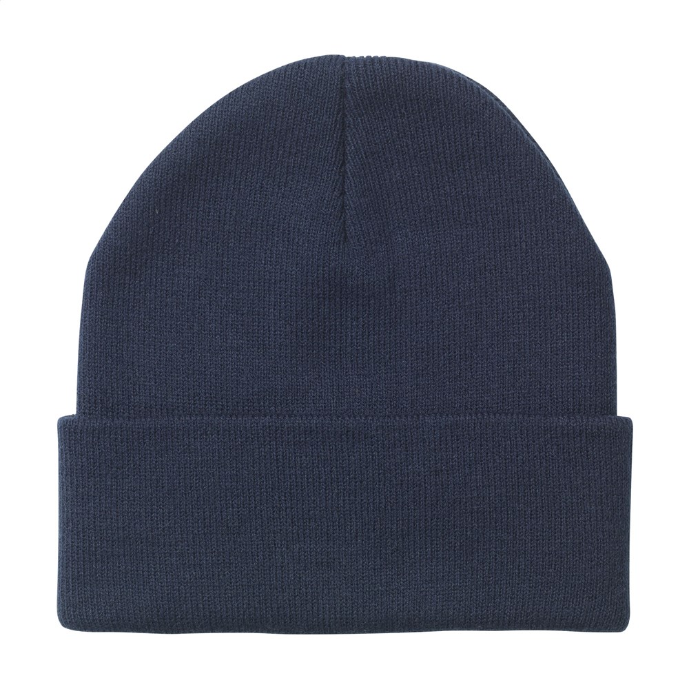 Gebreide muts met omslag. Van 100% RPET polyester. Populair, lekker warm en goede kwaliteit. One size. Met zwart label voor decoratie. GRS-gecertificeerd. Totaal gerecycled materiaal: 100%.